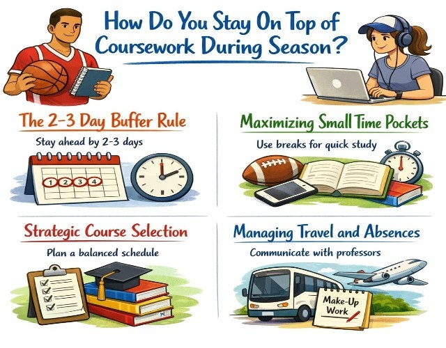 Stay on top of coursework by completing assignments 2 to 3 days before due dates building buffer for unexpected athletic demands, using small time pockets (15 to 30 minutes between classes, during travel, before practice) for quick tasks like readings or flashcards, attending all classes possible despite exhaustion maintaining understanding and professor relationships, batching similar tasks (all reading together, all math problems together) improving efficiency, and communicating proactively with professors about makeup work and extensions when travel or competition creates genuine conflicts.