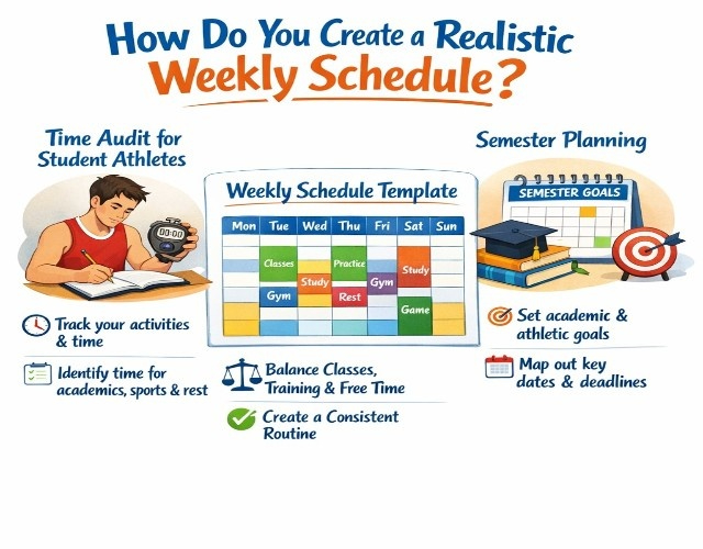 Create realistic schedules by calculating total weekly hours committed to athletics (20 to 30 hours), classes (12 to 18 hours), and studying (20 to 25 hours) totaling 52 to 73 hours, identifying non-negotiable time blocks (practices, games, mandatory study halls), scheduling study time immediately after classes when material is fresh, building in recovery time (7 to 9 hours sleep, meals, rest) essential for athletic performance, planning ahead for high-demand weeks (exam weeks, playoffs, championships), and leaving 2 to 3 hour weekly buffer for unexpected demands.