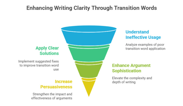 Remember: Transitions improve flow, but they can't fix unclear thinking. If you struggle placing transitions, the problem might be organization, not vocabulary. Step back, ensure your ideas follow logically. Do this by following a complete essay writing guide and then add transitions that make those connections explicit to readers.
