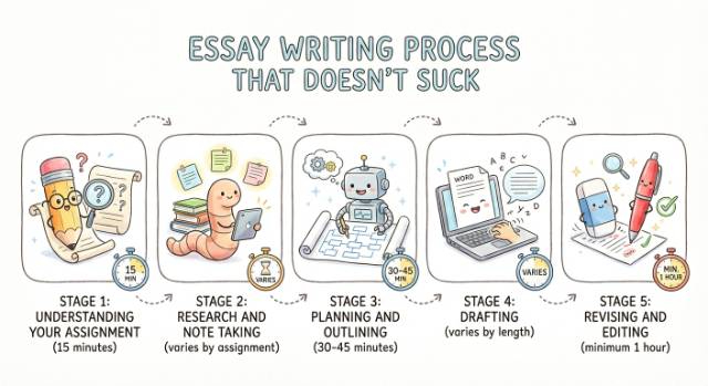 Here's the biggest mistake struggling writers make: they try to write perfect essays in one sitting, from introduction to conclusion, getting everything right on the first try. This approach maximizes stress and produces weaker essays. Professional writers use a completely different process that breaks essay writing into manageable stages you can actually handle. The Five Stage Process That Actually Works: